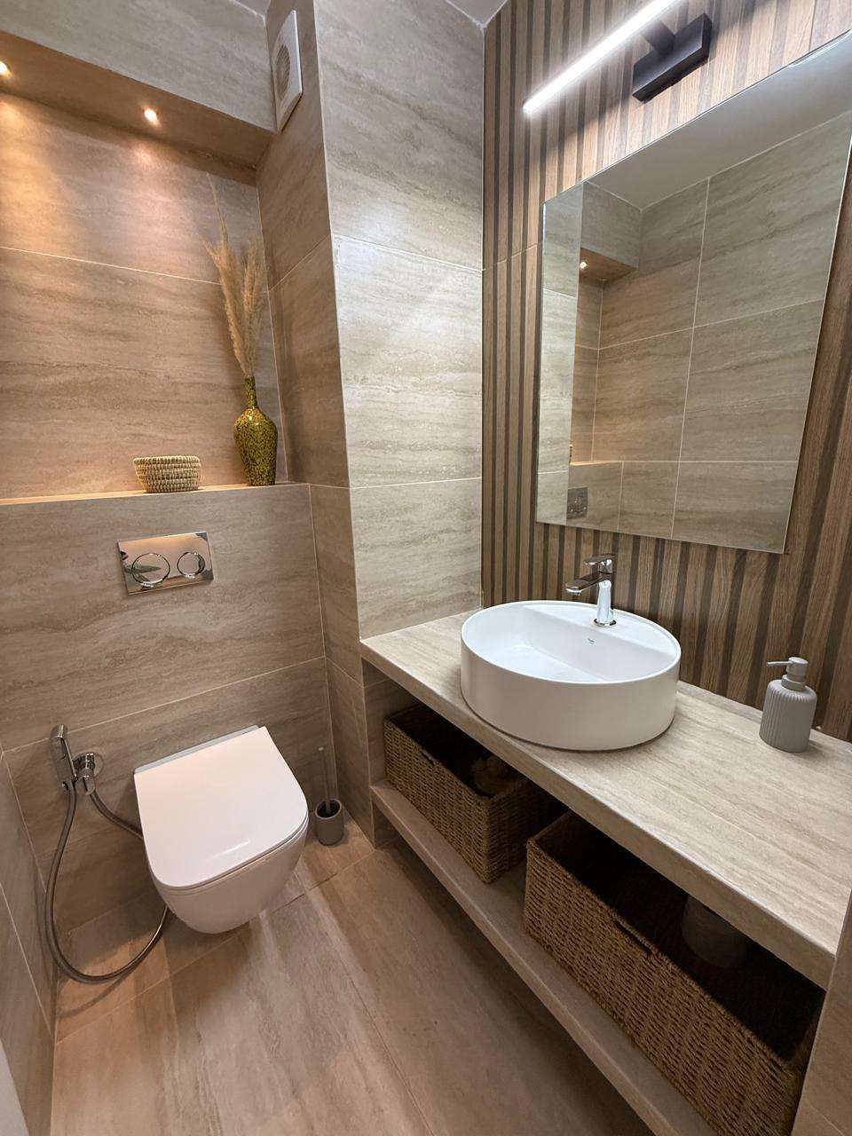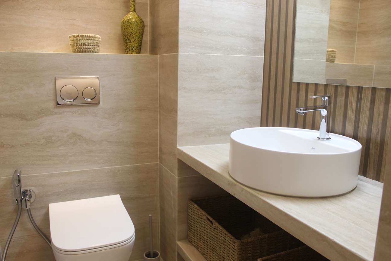 une salle de bain avec toilettes à l’étage et des toilettes au rez-de-chaussée.