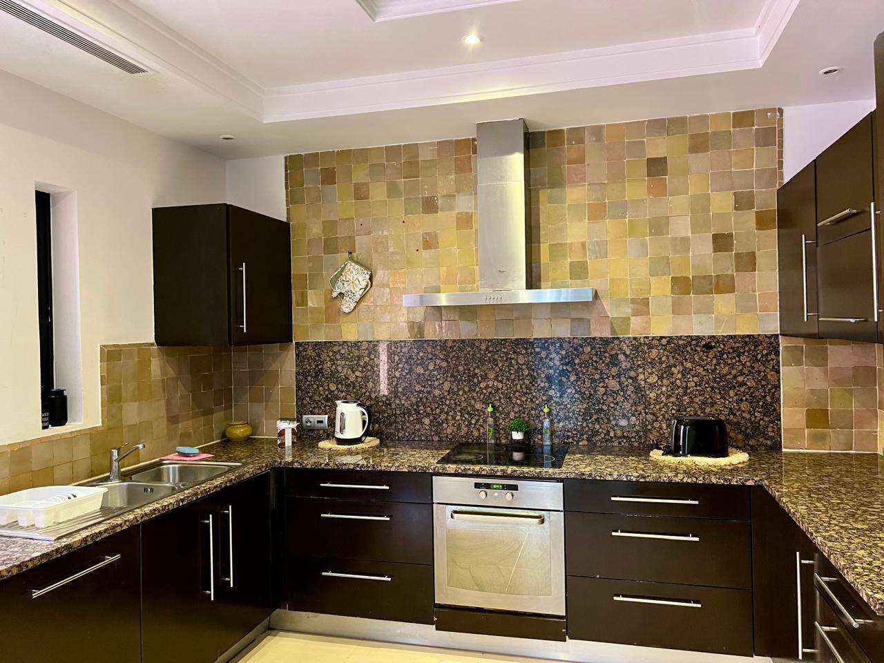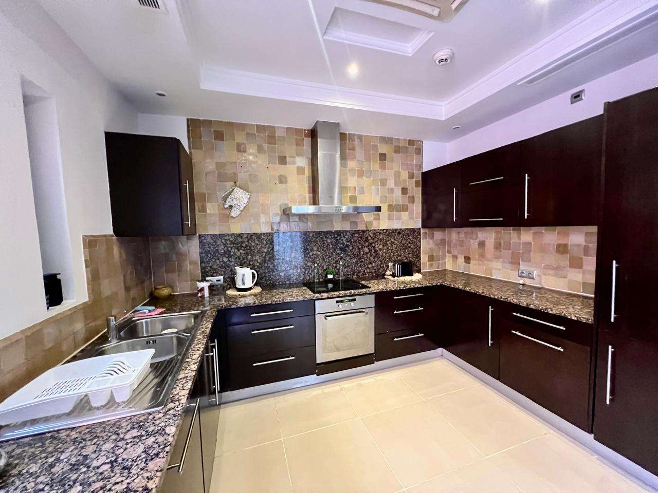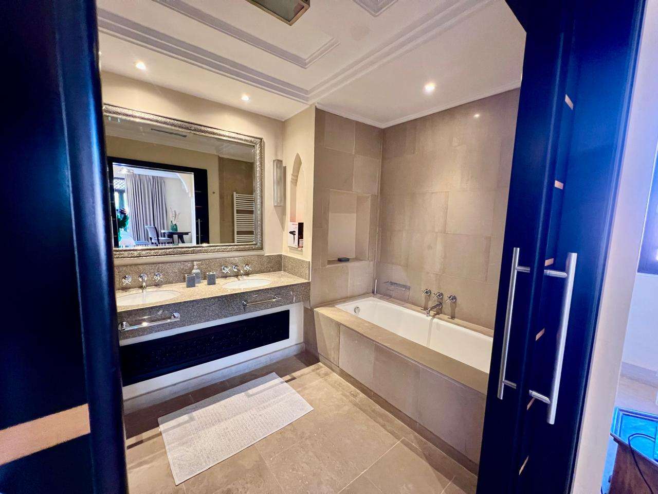 Implanté sur un terrain de 700 m², dont 400 m² habitables, il se distingue par ses beaux volumes, ses prestations haut de gamme et son ameublement raffiné. Il comprend 3 chambres avec salles de bain privatives, un vaste salon lumineux ouvert sur la piscine, une cuisine entièrement équipée ainsi qu’un superbe solarium aménagé avec bar.